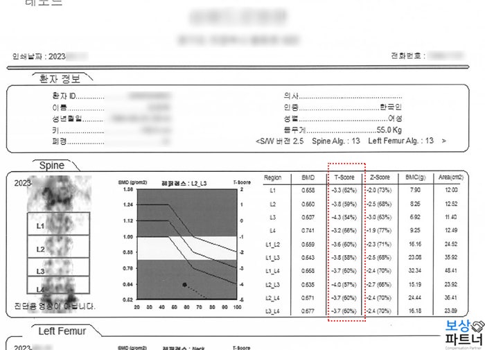 심한 골다공증 (T-score 수치 약 -3.7) ※ T-score 수치가 -2.5 이하면 골다공증, -2.5에서 -1 사이면 골감소증, -1 이상이면 정상으로 본다.