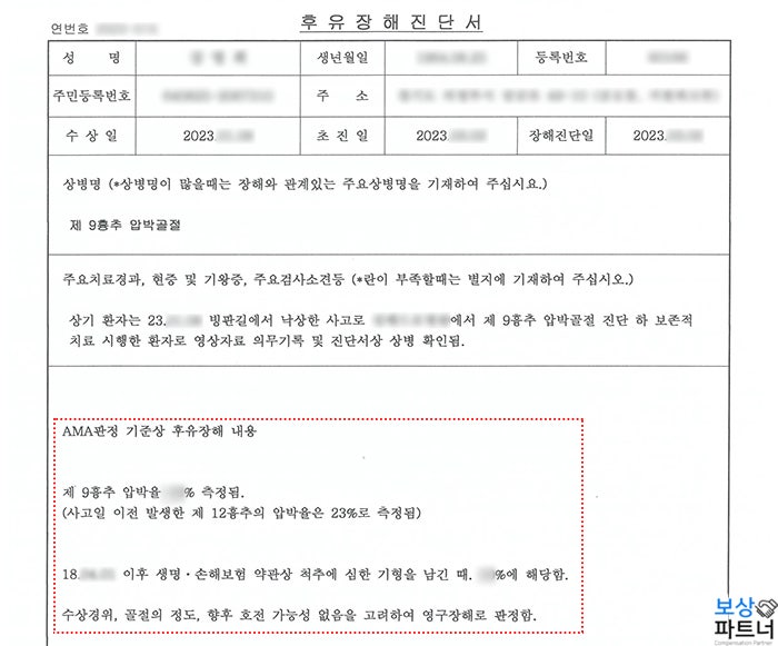 장해 지급률을 인정받기 위해서, 전문의로부터'후유장해 진단서'를 받아야 하는데요. 보험금 지급심사의 중요한 근거가 되기 때문에 제대로 발급받는 것이 무엇보다도 중요합니다. 흉추 골절의 경우 수술을 받지 않았더라도 골절 자체만으로도 보험약관상 후유장해 요건에 해당됩니다. (척추의 기형장해) 그리고 척추의 기형장해는 콥스각 측정방식(척추체의 기울기 변형) 또는 압박률 측정(척추체가 내려앉은 정도)하여 더 유리한 쪽으로 진단을 받아야 합니다.