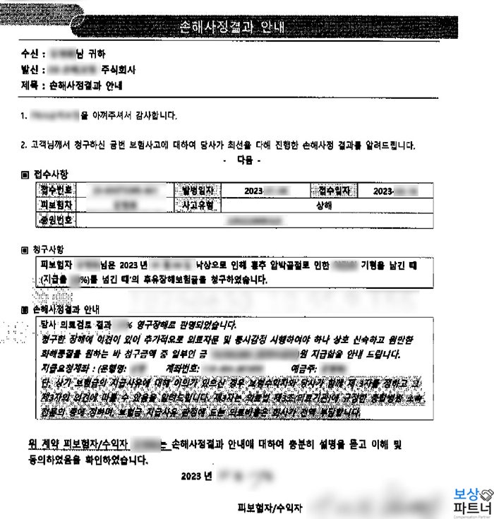 약 한 달간의 분쟁 기간이 끝나고 최종 심사 결과로 후유장해 보험금 약 2,000만 원을 수령하셨습니다. 평소에 착실히 보험료를 납부하지만 막상 보험금을 청구할 때에는 받아내기가 쉽지 않다는 것이 정말 안타까운 현실인데요.