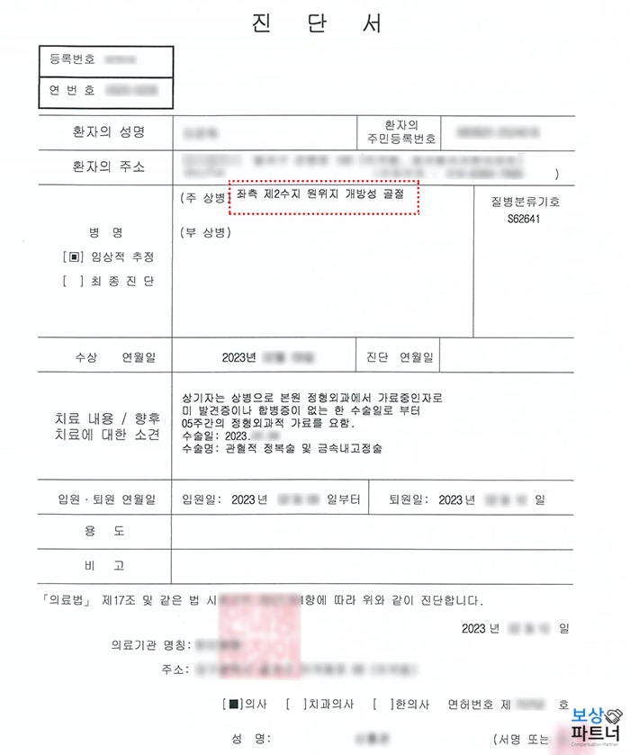 2,3수지 골절 지급률 10% 인정 사례 ☜ 클릭 5수지 골절 장해 보상 사례 ☜ 클릭