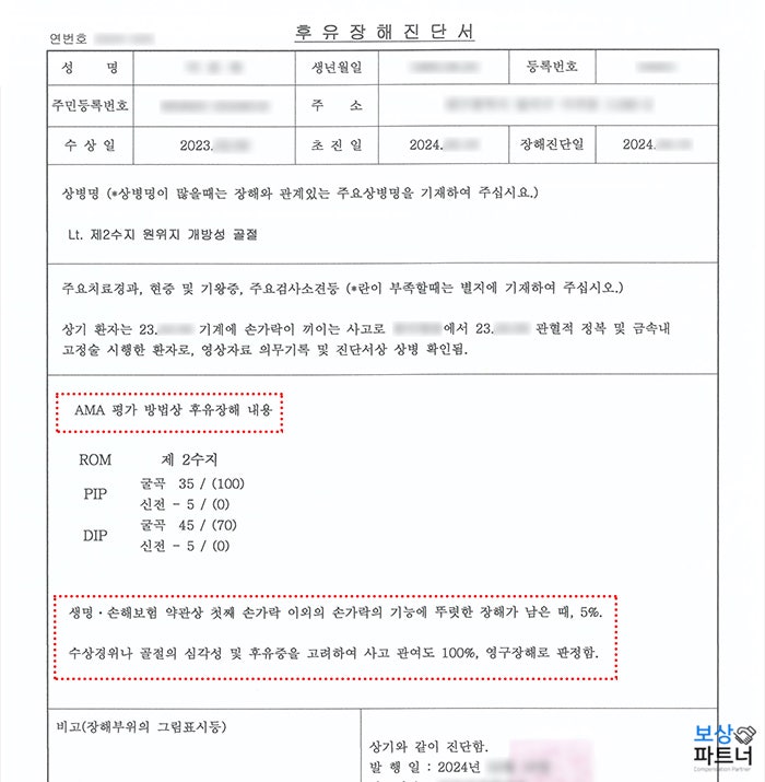 안녕하세요! 고객과 함께하는 손해사정 전문 《보상파트너》 입니다. 오늘 소개해 드릴 고객 사례의 주인공은 50대 이OO 님입니다. 검지손가락 골절되어 후유장해 보험금 수령하셨는데요.