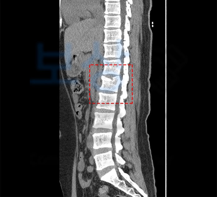 엑스레이 사진을 보면 허리 부근의 척추뼈 하나가 찌그러진 것을 볼 수 있습니다. 이러한 척추체 골절을 **'압박골절' **이라고 하는데요. 하중을 가장 많이 받는 흉추 11,12번이나 요추 1,2,3번 뼈가 가장 흔하게 압박골절됩니다.