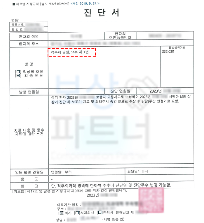 오늘 사건의 의뢰인께서는 횡단보도에서 차량에 치여 허리 뼈가 압박골절되는 사고를 당하셨는데요. 이런 경우에 개인보험과 가해 차량의 자동차보험에 어떻게 제대로 보상을 청구할 수 있었는지 함께 살펴보시겠습니다.