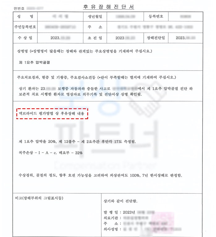 이OO 님께서는 먼저 가해 차량자동차보험 청구를 위해, '맥브라이드 장해 평가'를 받으셨는데요. 이를 통해 노동 능력 상실률(%)을 판정하여 정확한 **'상실수익액'**을 산정할 수 있게 됩니다.