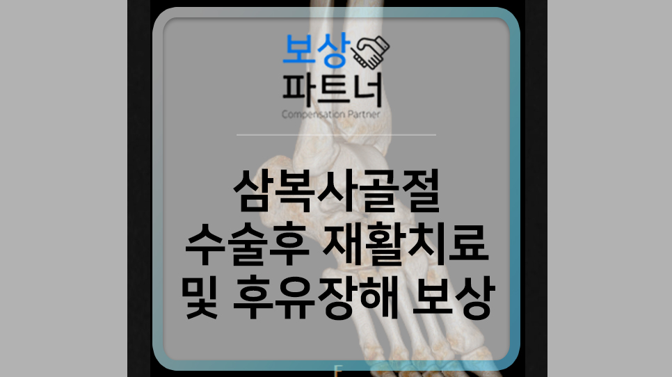 안녕하세요. 손해사정 전문 「보상파트너」 입니다. 삼복사골절이란 발목 관절 부위에서 내측, 외측, 후외측 복사뼈가 모두 골절된 상태를 말하는데요. 이렇게 발목의 세 면이 모두 골절되는 형태이기 때문에, 발목 골절 중 가장 심각한 부상 중 하나라고 할 수 있습니다.
