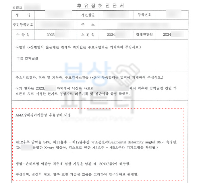제12흉추 압박률 54% 제11흉추 - 제12흉추간 국소분절각 36도 척추에 심한 기형을 남긴 때, **지급률 50% **(영구장해) 이후 보험사에서는 골감소증 등의 과거 병력을 삭감 요소로 주장하였고, 자체 의료자문을 통해 압박률에서도 다른 의견을 보였습니다.