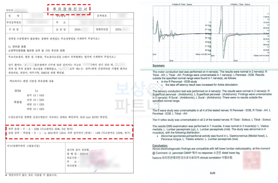요추부에 대해서는 근전도 검사(EMG)를 시행하였고, 발목은 관절 가동 범위(ROM) 검사를 통해 장해를 입증하였습니다.