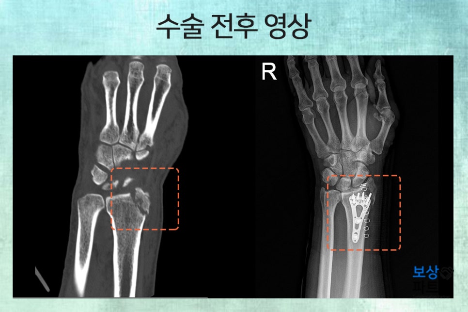 주상병은 요골 하단의 골절, 폐쇄성(S52520) 이었으며, 손목 부위의 관절을 침범한 골절이었습니다. 그래서 안정적인 고정 및 골유합을 위해 금속판과 나사를 넣는 고정술을 시행하였고, 향후 5~6개월 동안 장기간의 재활 및 통원 치료가 필요하였습니다.