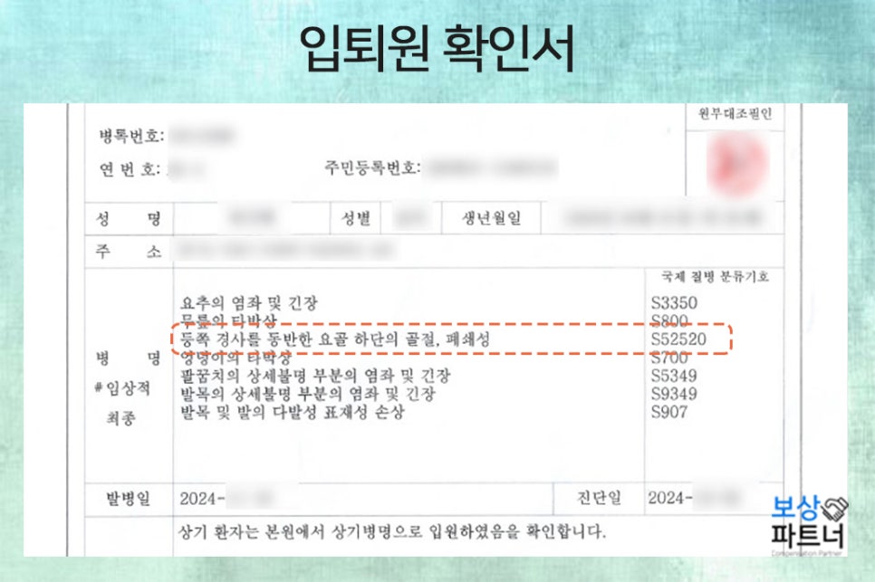 또한 골절 등의 심각한 부상을 입으셨다면, 섣불리 합의하지 마시고 전문가와 상담해 보시길 권해드립니다. **「보상파트너」**는 실무 경험이 풍부한 전문 손해사정사와 함께합니다. 합의금 관련 궁금하신 내용이 있다면 언제든지 무료상담 신청하실 수 있습니다. 감사합니다!