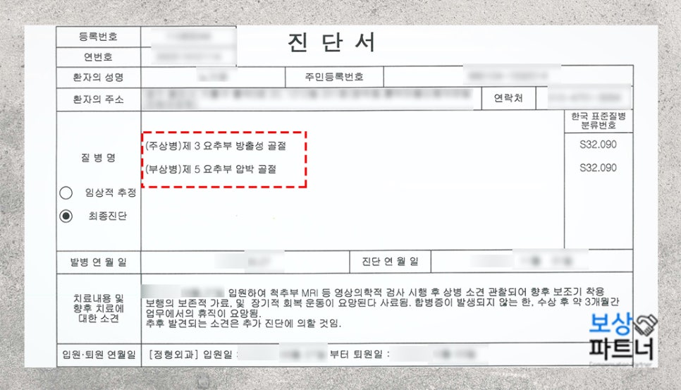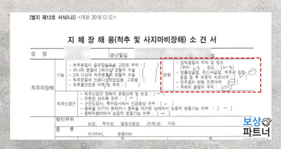 청구를 위해서 **'후유장해 진단서' **발급이 필수이며, 본인의 주치의로부터 또는 다른 병원의 정형외과 전문의로부터 발급받을 수 있습니다. 블로그 글을 보고 문의하셨던 고객께서는 보상파트너 손해사정사와 함께 청구 준비를 진행하셨는데요.
