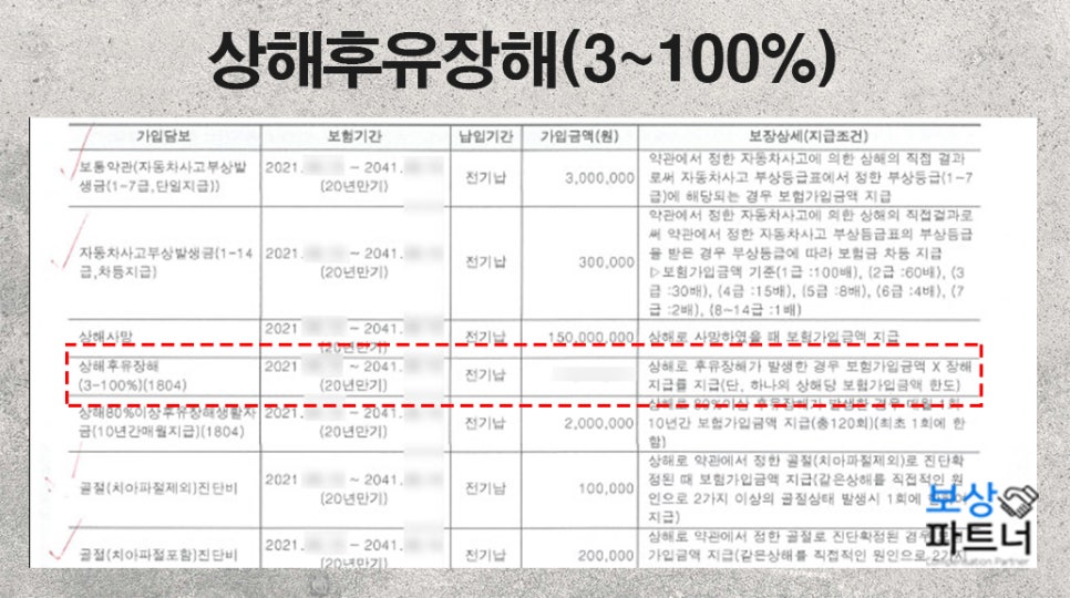 위와 같은 상해후유장해(3~100%), 또는 **재해상해특약 **등이 바로 후유증과 관련된 담보들입니다. 담보금액에 따라서 청구할 수 있는 금액은 수백만 원에서 수천만 원까지 될 수 있는데요.