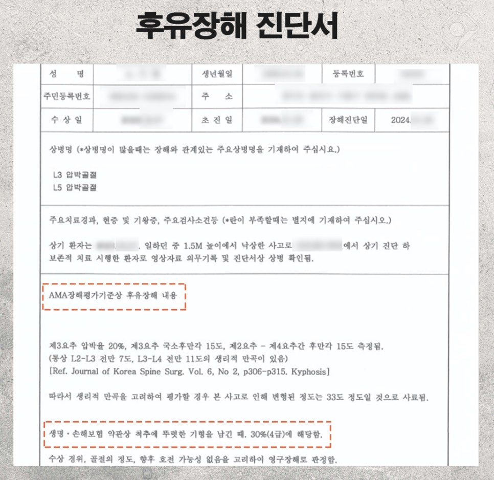 재해자께서는 L3(3번 요추) 압박률 약 12% 소견을 받았고, 최종 산정 등급은 13급으로 인정받았습니다. 그래서 산재 장해급여약 1,400만 원을 지급받으셨습니다. (평균임금 99일분) 그런데 산재 보상을 받은 후에도, 개인적으로 가입한 '후유장해' 담보가 있다면 추가적으로 청구하실 수 있는데요.