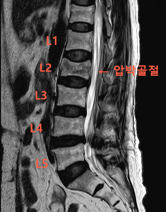 위 MRI 영상을 보면, 요추 2번이 찌그러지며 압박골절의 형태를 띠는 것을 확인할 수 있습니다. 환자분은 고령의 나이에다가 골다공증까지 심한 상태였으나, 다행히 비교적 안정형 골절의 양상을 보였는데요.