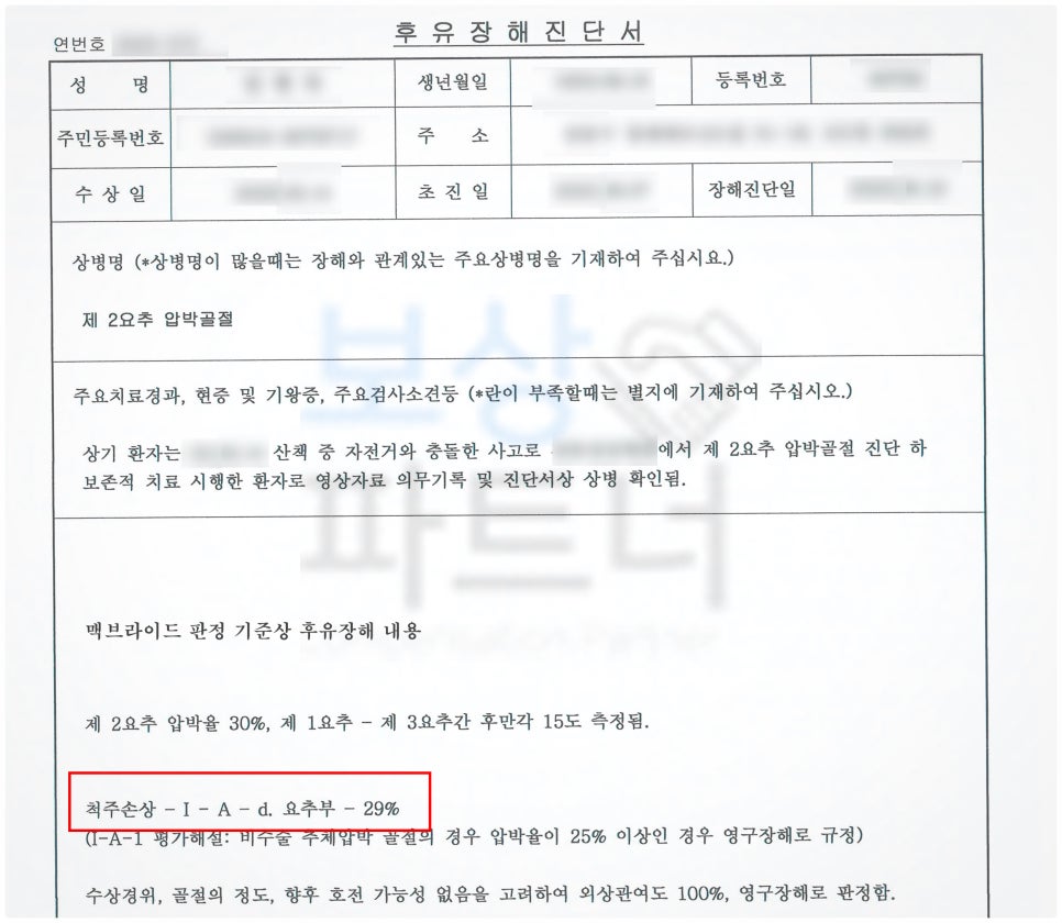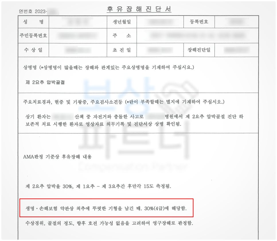 요추2번 압박골절(S32030)에 대한 **"후유장애 진단서"**를 공신력 있는 제3병원에서 발급받았고, 각종 유사 판례도 함께 제시하며 보상을 청구하였습니다.