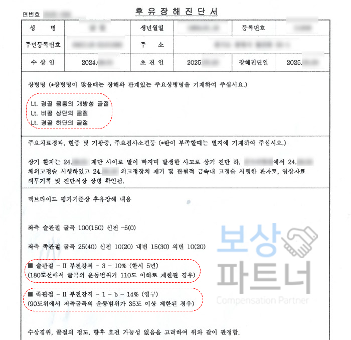 또한 경골의 개방성 골절과 비골 골절이 동반된 복합 손상임을 의학적으로 입증하고, 장기간의 치료 과정과 향후 예상되는 기능 장해를 종합적으로 평가하였습니다.