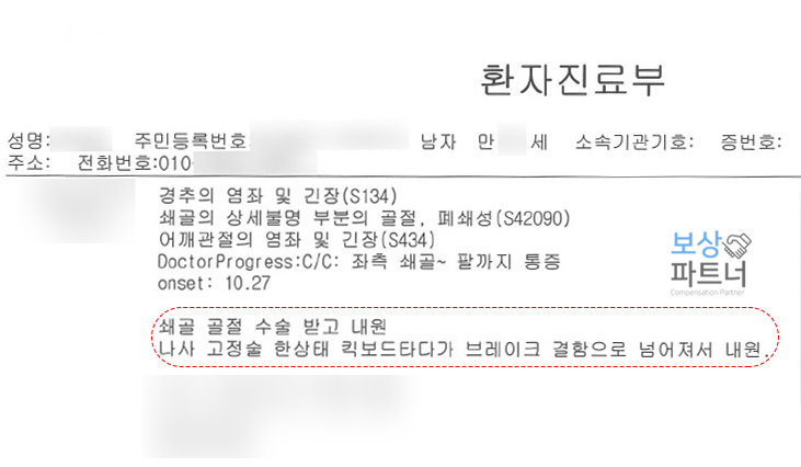 가속이 붙은 상태에서 당황한 의뢰인은 중심을 잃고 왼쪽 어깨 방향으로 넘어지고 마셨습니다. 현장에서 즉시 응급실로 이송된 의뢰인은 정밀 검사 결과 쇄골뼈 골절을 진단 받으셨습니다.