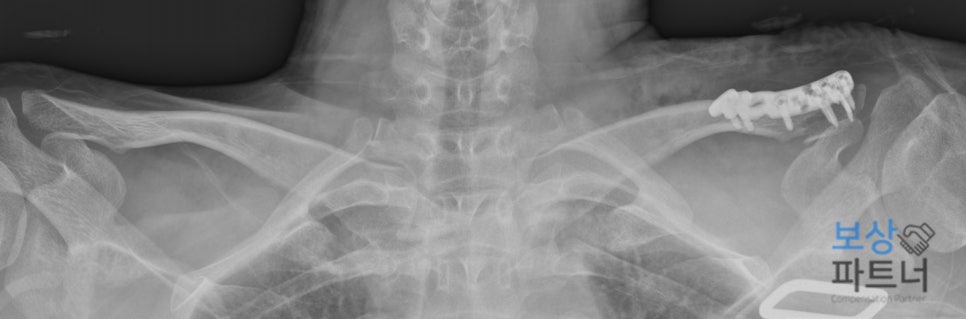 상단에 첨부한 사진은 실제 의뢰인의 X-ray 영상인데요.. 빨간 박스로 표시된 부분이 바로 쇄골 원위부입니다.