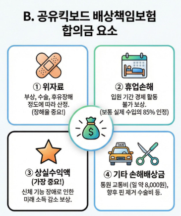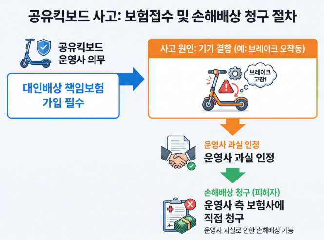 공유킥보드 운영사는 의무적으로 대인배상 책임보험에 가입되어 있습니다. 브레이크 오작동처럼 기기 결함이 원인인 경우, 운영사 과실이 인정되어 운영사 측 보험사에 피해자로서 손해배상을 청구할 수 있습니다.