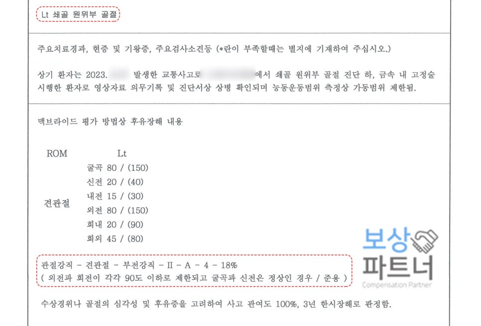 안타깝게도 대부분의 주치의들은 손해배상 관련 서류 발급에 소극적이며, "수술이 잘 되었으니 장해가 없다"는 입장만 고수하는 경우가 많습니다. 이에 저희 보상파트너는 제3의 전문 의료기관에서 의뢰인의 현재 상태(운동 제한 및 통증)를 객관적으로 평가 받을 수 있었는데요.