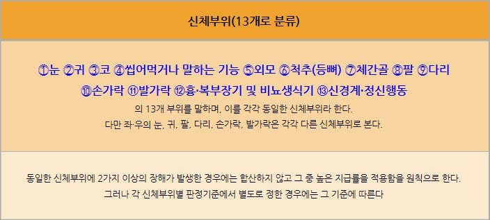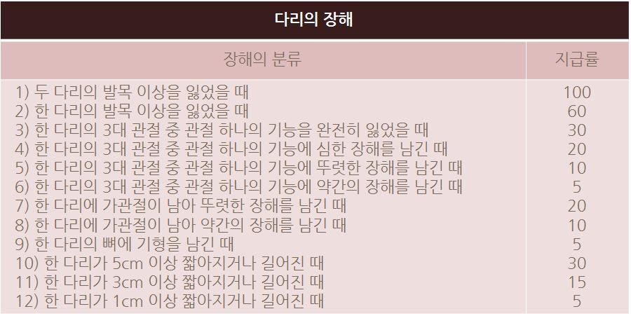 오늘은 첫 번째로 다리의 장해부터 살펴볼게요. 우선 다리의 장해분류표를 보실까요?