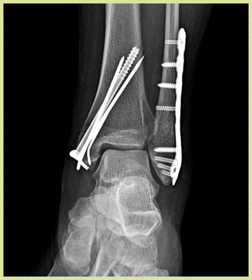 양측 복사 골절, 발목, 폐쇄성 좌측 관절 양과골 골절 S82820 진단을 받았습니다. 복사뼈의 안쪽과 바깥쪽이 모두 골절 된 상태. 이로 인해 수술을 받으셔야 했어요. 관혈적 정복술 및 금속판 내고정술을 받은 모습입니다.