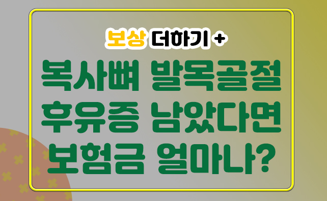 실금이 생긴 것부터 골절편이 많은 심각한 상태까지 모두 골절이라고 하는데요 복사뼈는 주변에 인대, 신경이 많은 부위라 회복이 된 후에도 후유증이 남을 가능성이 높아요. 따라서 복사 골절로 수술 받으셨다면 가입한 보험에서 후유장해 보상 받을 수 있도록 준비하셔야 해요.