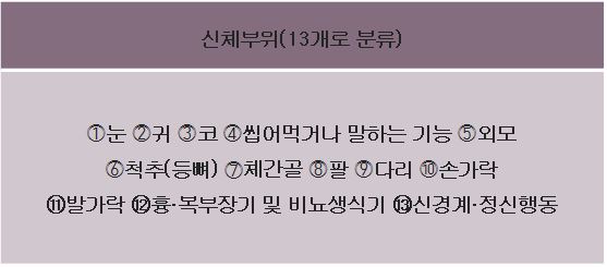 13가지 신체 부위마다 각각의 장해분류표가 있어요.