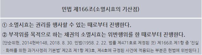 즉 민법에서 소멸시효의 기산점은 '권리를 행사할 수 있는 때로부터 진행한다’ 고 했습니다. 그럼 예를 들어 생각해 볼까요?
