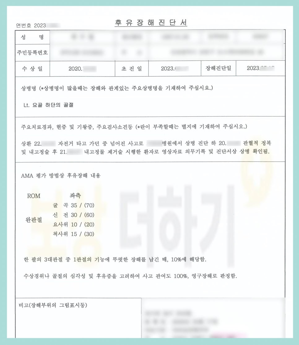 사례자는 공신력 있는 제3병원 전문의로부터 정확한 평가를 받았고 그에 대한 내용을 근거로 손해사정을 완료하였습니다.