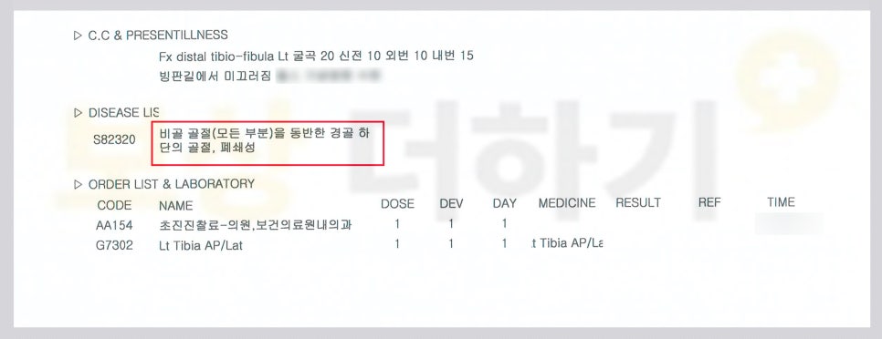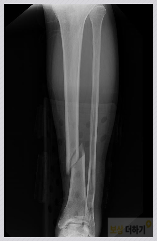 ▷진단명 S82320 비골 골절(모든 부분)을 동반한 경골 하단의 골절 신체의 다리(정강이뼈)는 경골과 비골로 구성되어 있습니다. 위의 사진으로 볼 수 있듯이 바깥쪽의 비교적 굵은 뼈가 경골, 안쪽의 가는 뼈가 비골입니다. 의뢰인은 이 두 개의 뼈 모두 다치셨는데요. 다리(정강이), 경비골 하단(발목)의 골절이 되었습니다.