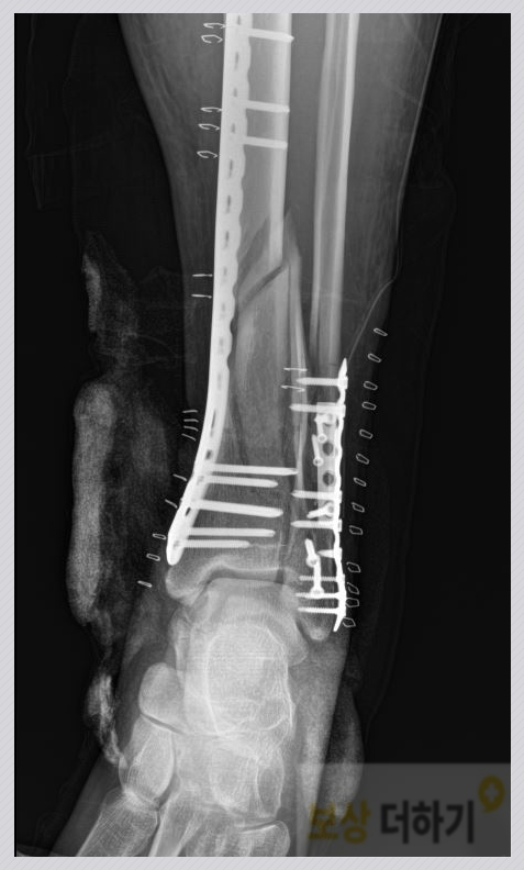▷치료 방법 비교적 경미한 부상인 경우 깁스를 하는 보존적 치료로도 충분하지만 의뢰인은 자연적인 뼈의 유합을 기대할 수 없어 내고정술을 통해 정복된 뼈를 단단히 고정시켜 주었습니다. 수술 후에는 3개월 이상 안정을 취하며 회복에 힘쓰셨어요.