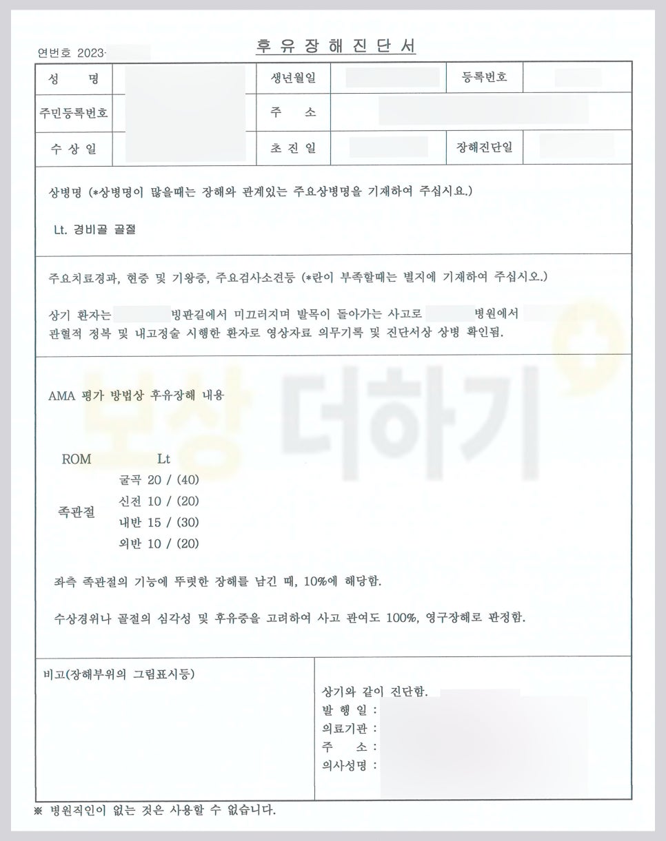 ▷후유장해 보험금 의뢰인은 경비골 골절 수술을 받았으니 치료비 외에 더 청구할 수 있는 보험금이 있을까 알아보셨어요. 저희에게도 문의 주셨기에 해당되는 보상 항목과 기대할 수 있는 금액 등, 자세히 상담 드렸습니다. 발목 관절 기능장해로 후유장해 보험금 받을 가능성이 있었고 이에 따른 손해 사정을 저희에게 위임해 주셨습니다.