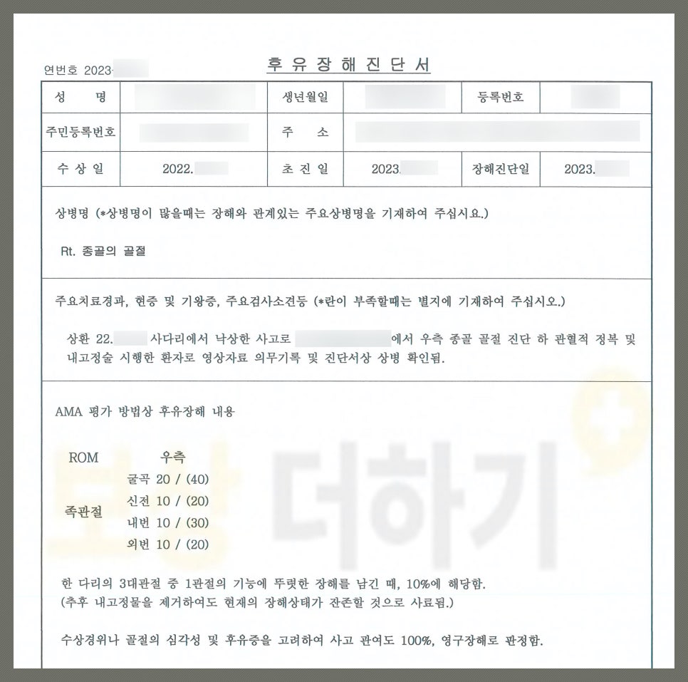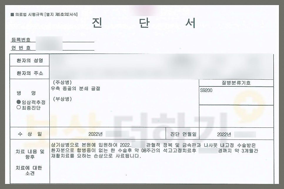 후유증 남아.. 분쇄골절의 경우 관절염 발생이 일어나거나 발목관절의 움직임, 힘을 주는 것에 제한이 발생하기 쉽습니다. 따라서 종골 골절 수술하셨다면 후유장해에 대해 생각하셔야 합니다. P 님은 보험금을 받기 위해 알아보셨는데 혼자 진행하기에 어려움이 있어 저희에게 의뢰를 하고 손해사정 업무를 위임하셨어요.