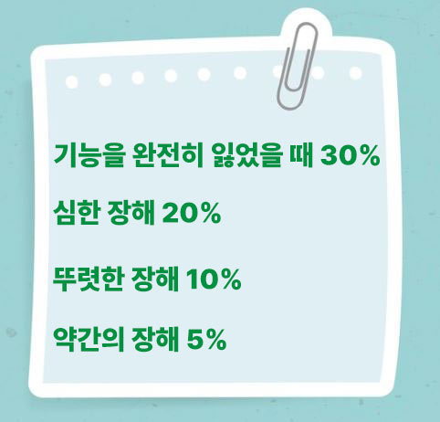 그럼, 위의 '완전히 잃었을 때' '심한' '뚜렷한' '약간' 은 어떻게 결정될까요? 발목 관절을 위아래, 안쪽, 바깥쪽으로 움직였을 때의 각도를 재는데요. 제한되는 정도가 1/4 이하인지, 1/2 혹은 3/4 이하인지에 따라 결정됩니다. 예를 들어 3/4 이하라면 '약간의 장해'에 해당되어 지급률 5%가 인정됩니다. 즉 가입금액이 5천만 원이면 5천만 원 × 5% = 250만 원 을 받을 수 있습니다. 만약 '뚜렷한 장해'에 해당될 경우 보상 금액은 2배가 되는 것이죠.