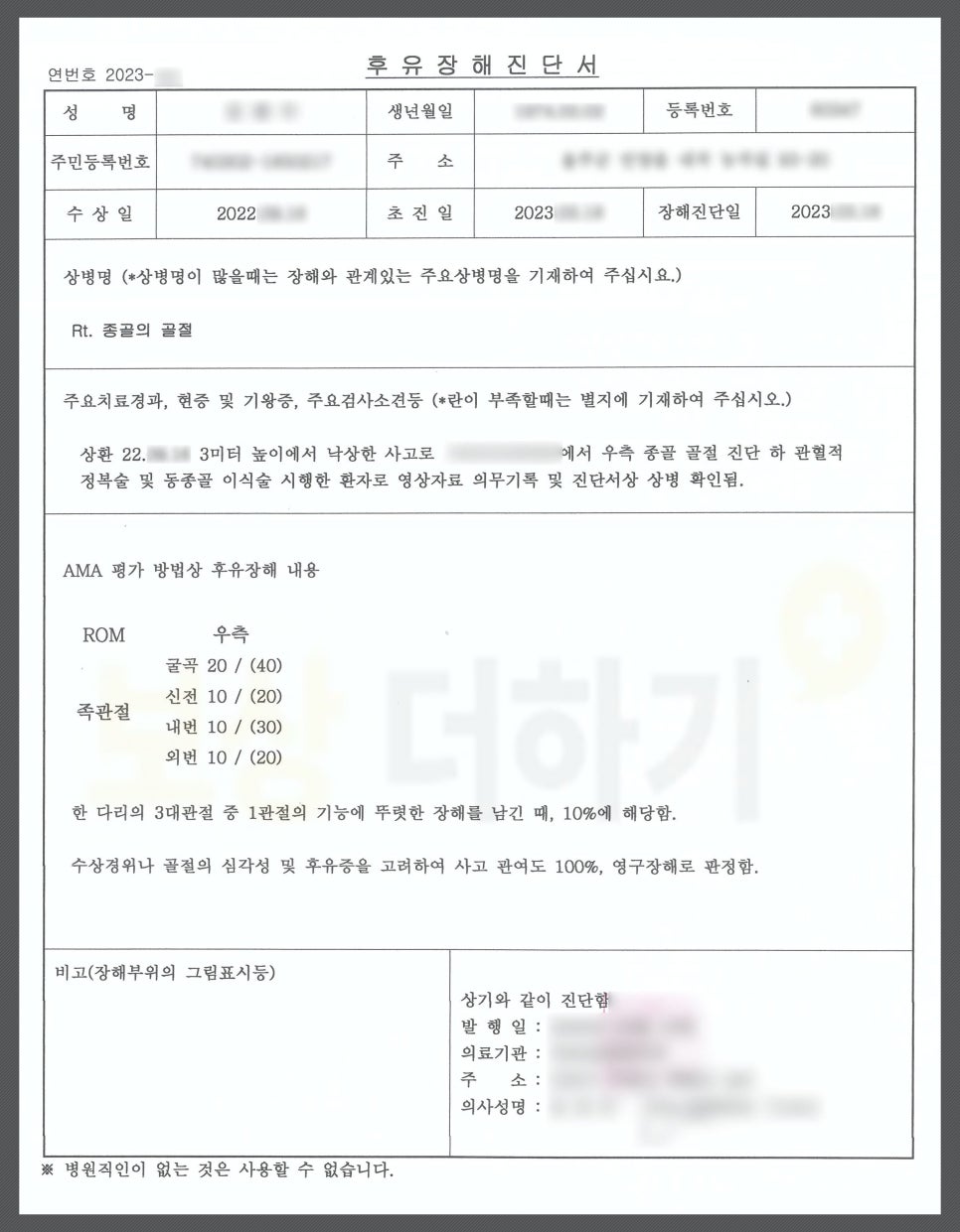 이렇게 수술까지 받으셨다면 후유증이 남을 것을 생각하여 개인보험 후유장해 보상에 대해 알아보셔야 합니다. K 님은 감액되거나 부지급 없이 적정한 보상을 받기 위해서 전문가의 도움이 필요함을 느끼셨고, 저희에게 손해액 산정 등 관련 업무를 위임해 주셨어요.