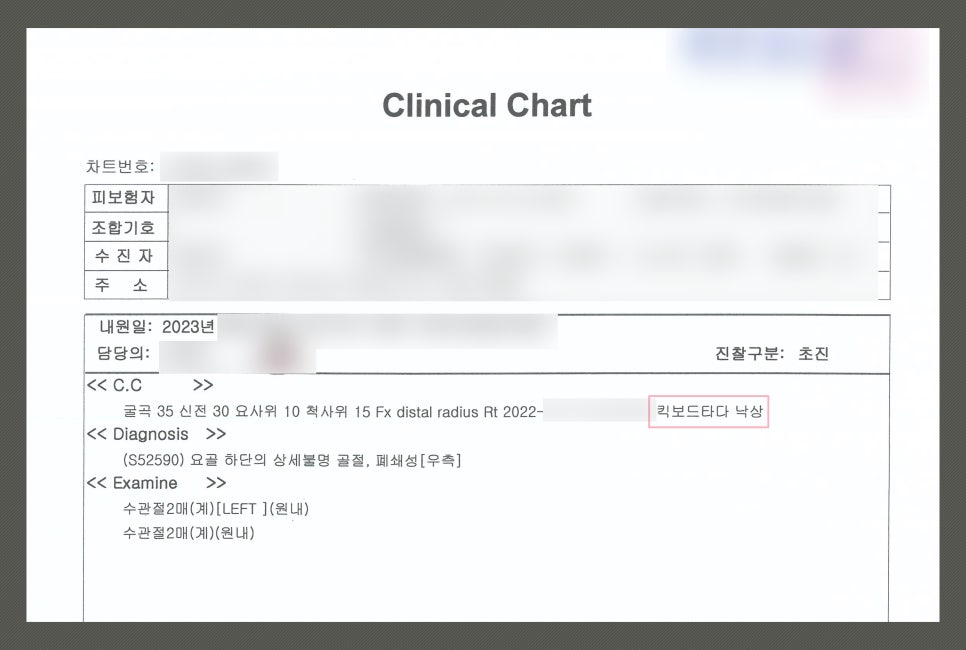 킥보드를 타다가 넘어져서 다치게 된 H 님은 내원하여 검사를 한 결과 S52590 요골 하단의 골절(요골 원위부) 즉 손목이 골절되었다는 진단을 받았습니다. 뼈의 어긋남이 심해서 깁스만으로는 유합이 어렵기에 수술 치료를 해야 했습니다.