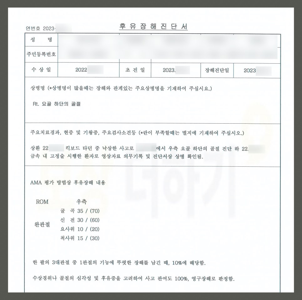 장해진단서 발급부터 쉽지 않은 과정 위에 간단히 설명드린 것처럼 장해 정도에 따라 지급률이 달라지기 때문에 실제 나의 상태를 제대로 평가받아야 적정한 보험금을 받을 수 있습니다.