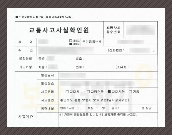 K 님은 아파트 입구 쪽의 횡단보도를 건너고 있었는데요. 그때 입구로 들어오던 한 차량에 의해 충격 당하면서 일어난 교통사고였습니다.