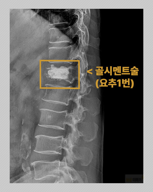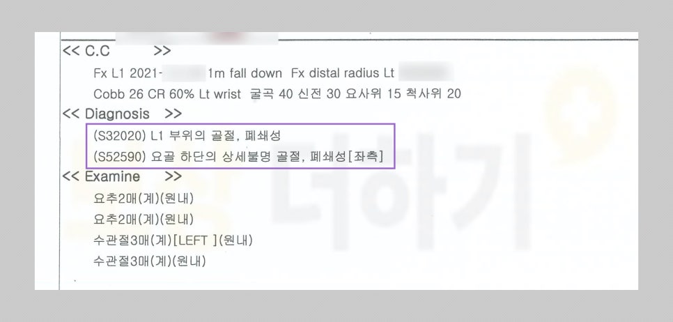 K 님은 PVC 배관 해체 작업 중 파이프가 순식간에 빠지면서 뒤로 넘어지셨어요. 》》》 진단명 L1 부위의 골절 S32020 요골 하단의 골절 S52590 -> 허리 뼈인 요추 1번과 손목의 골절이 일어난 것입니다. 》》》 치료(수술, 시술) 압박골절된 요추 1번은 척추체의 추가적인 변형을 방지하고자 의료용 시멘트를 삽입하는 척추성형술을 받으셨습니다.