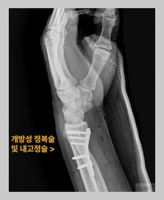손목은 수술이 필요한 상황이었어요. 안정적인 뼈의 유합과 회복을 위해서 골절 부위를 절개하여 정복을 한 후에 움직임이 없도록 고정을 해주는 내고정술이 이루어졌습니다.