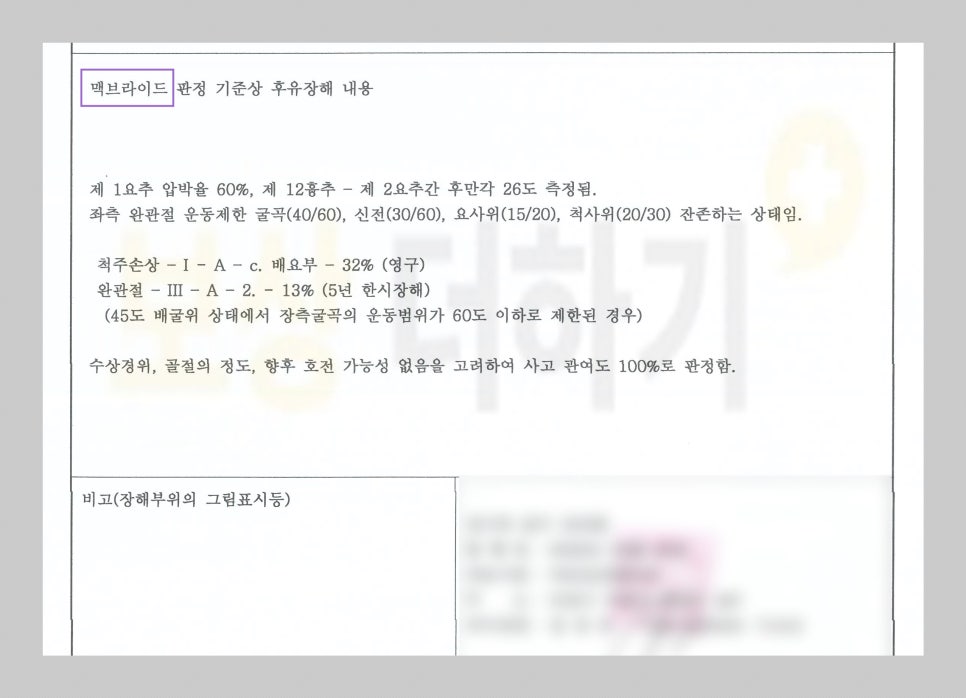 》》》 장해 평가는 산재 장해급여를 신청할 때 제출한 장해 진단서는 근재 보험 청구 시 사용할 수가 없습니다. 맥브라이드 평가 법에 의한 장해 진단서를 발급받아야 하는데요. 주치의에게 요청했을 때 거절을 당하는 경우가 많고, 의사는 이와 관련된 기준을 세세히 알진 못합니다. 결국 재해자의 실제 상태에 못 미치는 정도의 보상을 받을 수도 있죠. 저희는 K 님이 이러한 손해를 겪지 않도록 최선을 다해 도움드렸습니다.