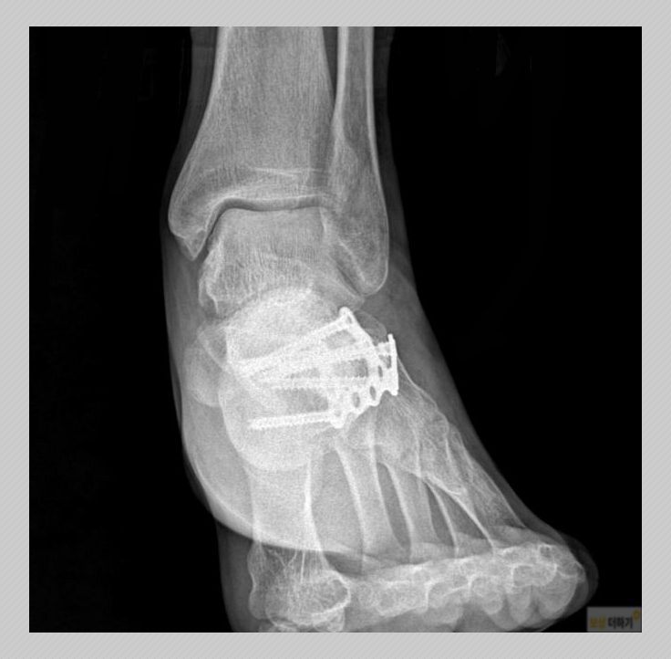 간단히 말씀드리면 왼쪽 발뒤꿈치 부상인데요. 골절 정도가 경미하지 않았습니다. 관절면 내 관절 부분까지 침범을 하였고 분쇄 부러진 뼈가 3조각 이상이었습니다. 이러한 형태의 골절은 수술 후에도 외상성 관절염, 관절 강직 등 후유증이 남을 확률이 높습니다. 따라서 치료와 회복에 있어서 상당한 주의가 필요한 것입니다. 아래 사진은 의사의 권고에 따라 수술 시행 받으신 모습입니다.