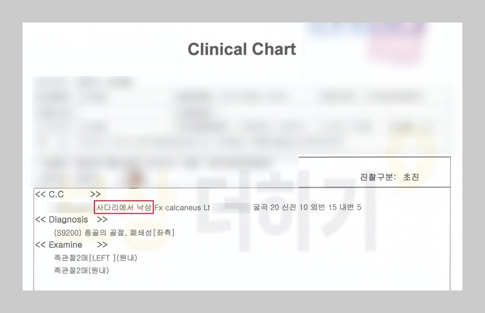 동료 직원들의 도움을 받아서 즉시 내원을 하여 검사한 결과는 다음과 같습니다. 진단명: 좌측 족근부 종골 관절면 내 분쇄 골절 S9200