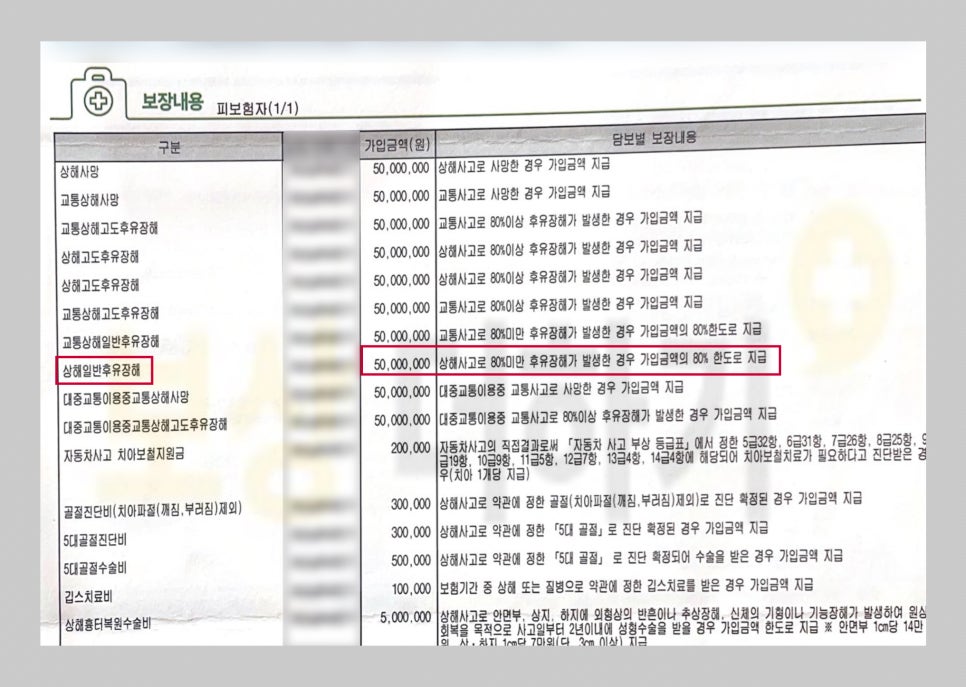 보험증권에서 사고 전 개인적으로 가입한 보험에 후유 장해 담보가 있는 계약이 있는지 확인해 보세요. 자세한 명칭은 상품에 따라 조금씩 다를 수 있는데요. * 상해 일반 후유 장해 * 장해 급부금 * 일반재해장해 급부금 위와 같은 명칭을 찾아볼 수 있어요. (해당 보험사 콜센터에 문의하셔서 확인할 수 있어요)