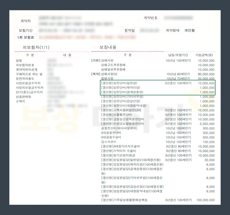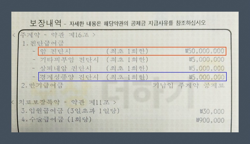 (위의 사진) 사례자의 실제 보험 가입 내용을 보시면 일반 암 진단 시 5천만 원이 지급되지만 경계성종양 진단 시 5백만 원(10%)만 지급이 되죠. (아래 사진) 일반 암은 1천만 원이지만 경계성 종양은 1백만 원이 지급된다는 것을 확인할 수 있어요. ※ 이렇듯 보상 금액에 차이가 크기 때문에 청구하시기 전에 신중히 알아보셔야 합니다.
