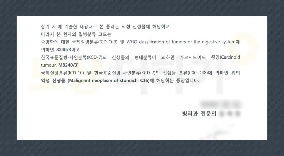 K 님이 주치의에게 받은 진단코드는 위에 언급한 것처럼 D371이었습니다. 보험사에서는 암이 아닌 경계성종양으로 판정된 것이기에 10%만 지급한다는 입장이었습니다. 하지만 양상이나 예후와 상관없이 단지 D 코드 발급받았다는 것만으로 이러한 결과가 생기는 것은 환자 입장에서 너무 억울한 일입니다. ★ 유의할 점은 발급받은 진단코드와는 별개로 한국 질병 분류 기준 및 국제 종양 분류 기준에서 신경내분비종양은 악성 종양으로 구분되어 재개정되었다는 점입니다. 이러한 사실을 바탕으로 보험금을 확실하게 수령하셔야 합니다.