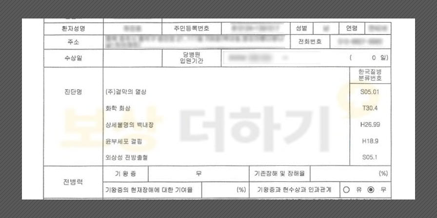 허 00님은 해당 사고로 상당한 시력 저하 외에도 장기적인 치료에 따라 경제적, 심리적 고통이 매우 컸습니다. 일을 하다가 다치셨기 때문에 산재보험을 통해 보상은 받으셨지만 실제 받은 손해를 금액으로 따졌을 때 결코 합당한 보상이라고 할 수 없었죠. 개인적으로 가입하신 보험에서도 최대한 보상을 받는 것이 좋겠지만, 실제로 청구를 할 때 어려움이 있습니다. 그 이유는 뭘까요? 위에 간단히 설명드린 바와 같이 보험약관상 후유장해 기준이 있습니다. 따라서 그 기준에 맞는지 장해 진단을 받아야 하는데요. 의사분들이 이러한 기준에 대해 잘 알고 있는 것이 아니다 보니까, 특히 눈의 후유장해 진단을 해본 의사는 많지 않기 때문에 도움을 받는 것이 매우 어렵습니다. -> 의학적으로 객관적인 근거가 뒷받침되지 않는다면 보상은 불가능합니다.