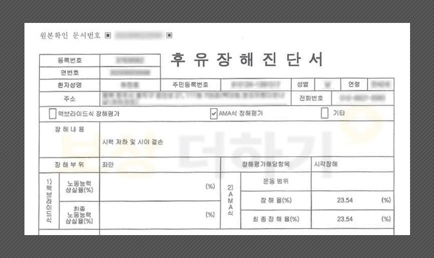 (↑장해 진단서) 허 00님은 개인적으로 보험금 청구하는 것은 어렵다고 생각해 「보상 더하기」에 사건을 위임하셨습니다. 해당 상해 사고로 인해 시력 저하가 있게 되었으며, 그 정도를 정확하게 평가받을 수 있도록 공신력 있는 의료기관에 의뢰를 하였습니다.