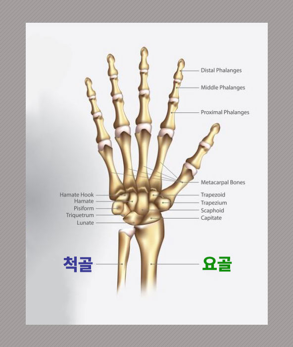요골, 척골 용어가 생소하실 텐데요. 위의 사진으로 보시면, 아래팔의 2개의 뼈가 보이죠. 요골은 팔꿈치부터 엄지손가락 방향으로 손목까지 뻗어있는 긴 뼈이고, 척골은 아래팔의 안쪽에 위치한 뼈입니다. 요골 원위부(하단), 척골 경상돌기 즉 손목 부위가 골절된 것입니다.