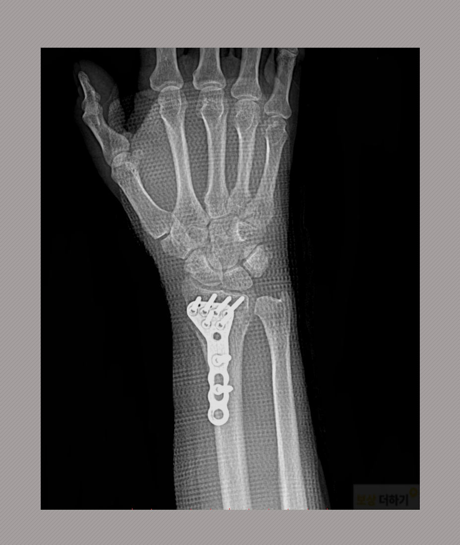 관혈적 정복 및 내 고정술 시행 받으신 모습입니다. 부러져 어긋난 뼈를 본래 정해진 위치로 재조정하여 유합과 안정화를 하는 수술 원위 요골 고정 후에는 원위 요척 관절의 불안정성이 없어서 경상돌기의 추가 고정은 시행하지 않았습니다. 수술 후 약 6주간 부목 고정을 했고, 통증이 조절된 후 손목 관절 운동을 시작했습니다. 꾸준한 재활 치료를 통해 관절의 강직 등 후유증이 남지 않도록 하는 것이죠.